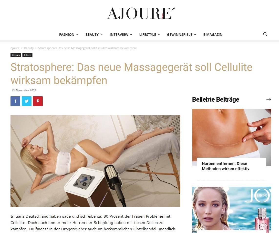 О массаже Stratosphere написало известное немецкое издание AJOURE. Читательницы этого женского журнала – современные женщины, которые интересуются тенденциями моды, вдохновляющим лайфстайлом и, конечно же, действенным уходом за телом.