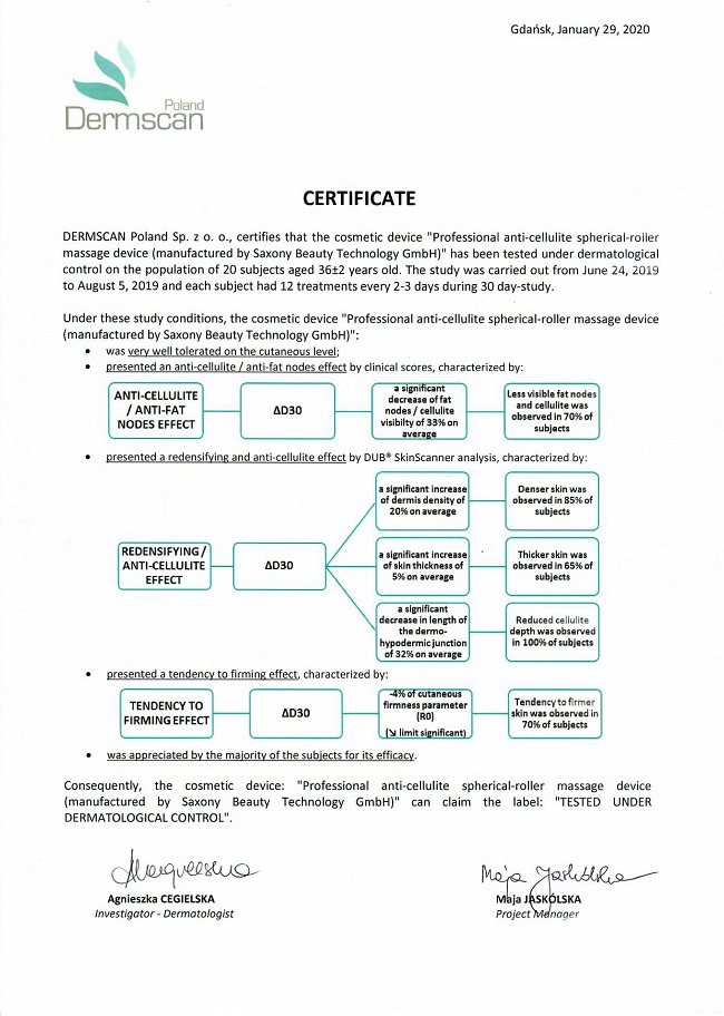 Висока ефективність масажу з допомогою апарата TM Stratosphere (Стратосфера) клінічно доведено незалежною лабораторією Dermscan.